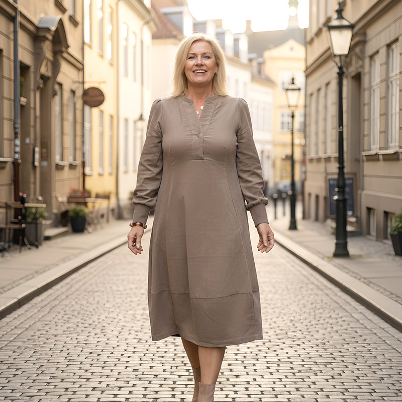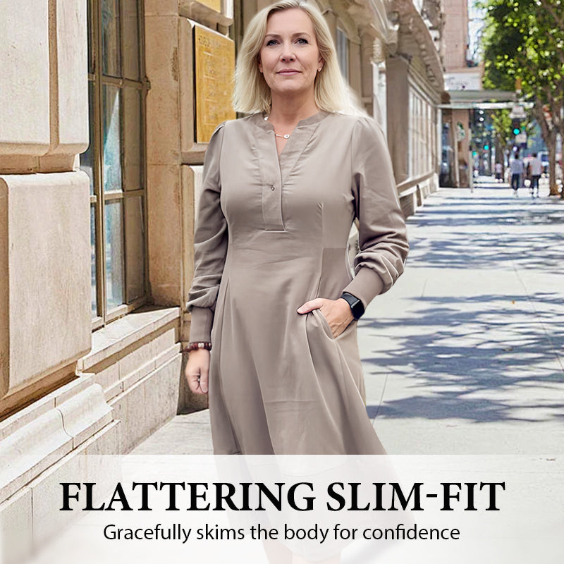 THOUGHTFUL DETAILS: The front button placket adds a touch of classic sophistication, while the two generous side pockets provide practical utility without compromising the dress's clean lines.